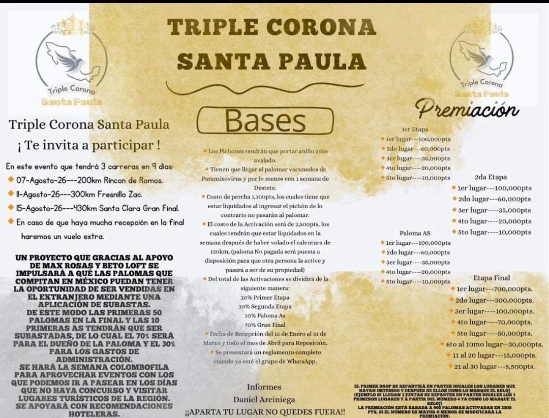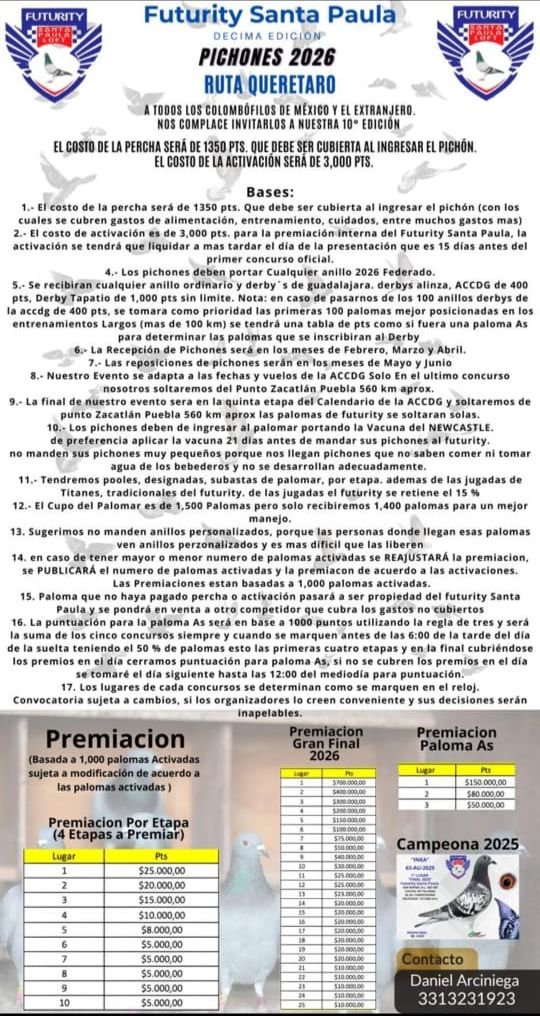 Futurity Santa Paula es un club de colombofilia ubicado en Guadalajara, Jalisco, reconocido por su excelencia en la crianza y competencia de palomas mensajeras. Bajo la dirección de Daniel Arciniega y su equipo, se ha consolidado como un referente nacional.