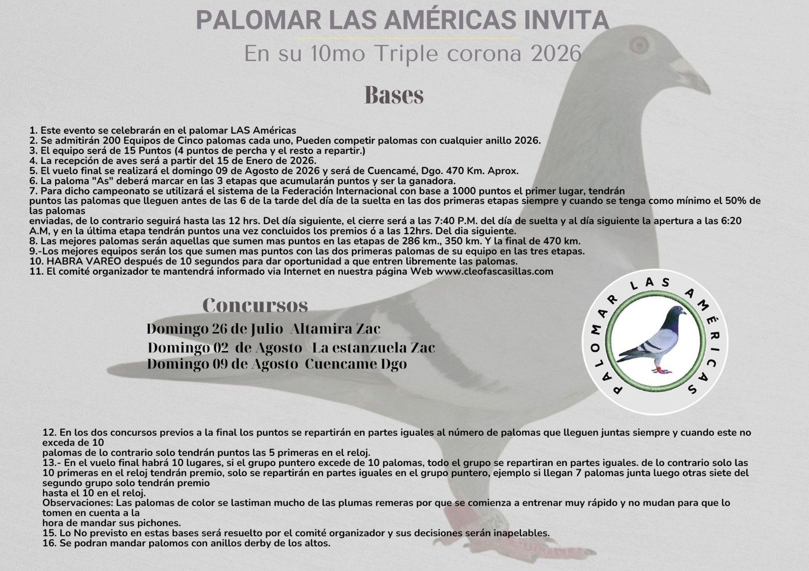 Palomar Las Américas se ha posicionado como un escenario clave para la colombofilia internacional. Ubicado en Capilla de Guadalupe, ofrece instalaciones de primer nivel para la temporada Americas PRO 2025. Bajo la dirección de Cleofas Casillas, garantizamos un manejo profesional, transparente y competitivo, reuniendo a criadores de élite en una sola ruta.