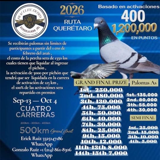 En Ruiz Elite Derby, combinamos la tradición colombófila con las técnicas modernas de entrenamiento. Ubicados en Zapopan, Jalisco, ofrecemos una de las rutas de vuelo más desafiantes y justas del circuito nacional.